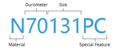 KODA’s O-ring part numbers are designed to describe their material, hardness, size, and any special functions. For example, the image below shows the part number of an O-ring made of nitrile rubber, with a hardness of 70, a size of 131, and a peroxide vulcanization process. See the table below for more abbreviations for materials and special functions.